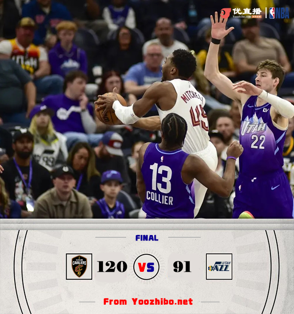 JRS直播吧讯北京时间3月24日讯 NBA常规赛,爵士主场迎战骑士,爵士目前16胜55负西部垫底,骑士近期已经4连败,但56胜14负依然稳居东部榜首。比赛开始,骑士众将发力打出不错开局,随后接连外线发炮领先到双位数,凯斯勒里突外投强势止血,朱赞三分再中爵士首节追到差6分,次节塞克斯顿接连突破一波8-0一度助队反超比分,骑士短暂断电后阿伦内线给出回应,双方展开拉锯战,次节双方打平。下半场,爵士突然断电4分钟内一分未得,骑士多点开花,外线也回暖打出23-4超级攻击波一举拉开20分以上领先,末节爵士连续5记三分追分,但骑士总能回应守住20分以上领先,双方随后练兵,最终骑士120-91轻取爵士,终止4连败。