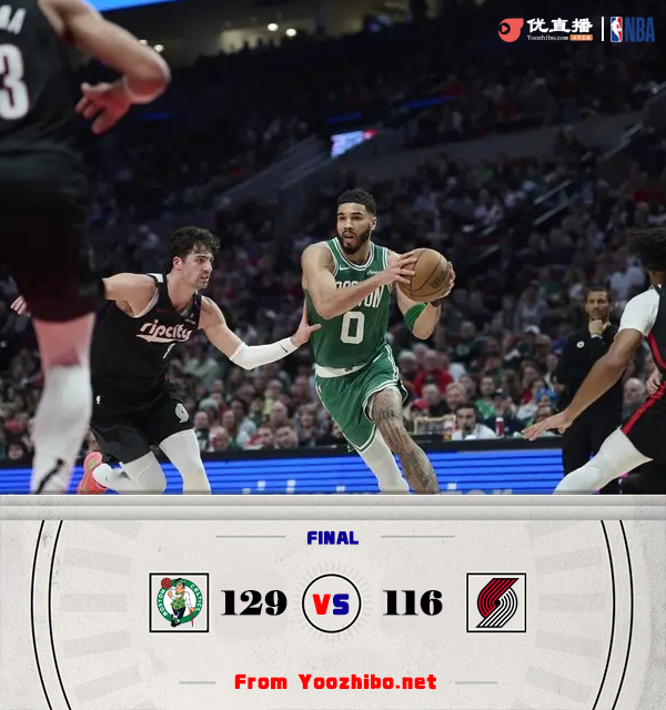 JRS直播吧讯北京时间3月24日讯 NBA常规赛,开拓者主场迎战凯尔特人。两队都是4连胜,开拓者32胜39负西部第12,凯尔特人51胜19负东部第2。本场比赛,杰伦-布朗继续缺阵,霍勒迪和波尔津吉斯也不打。比赛开始,普理查德上来连续被吹犯规很快3犯下场,双方外线连续对飙,凯尔特人更胜一筹,塔图姆接连送助攻带队首节领先10分,次节开拓者发力连续反击一波12-0直接追平比分,霍福德接连中远投止血,绿军回应9-0稳住领先优势,随后凯尔特人外线继续发炮半场领先13分。第三节,塔图姆开始发力,里突外投单节轰下18分,凯尔特人一度拉开近20分领先,但顽强的开拓者还是追到差12分,末节双方继续对攻战,外线你来我往,但凯尔特人始终保持十几分领先,最终凯尔特人129-116力克开拓者,拿到5连胜同时终结对手4连胜。