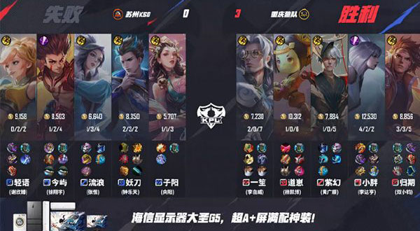 第二局:开局至七分钟双方经济一直持平,十二分钟KSG奔狼直冲落单关羽一套comb关羽被带走,十四分钟KSG典韦绕后集火朵莉亚但被狼队跟上反打一波0换4,KSG经济被反超,十八分钟女娲先秒典韦,重庆狼队一换三后直推水晶,再下一城!本局MVP为狼队归期 (双小钧)关羽!