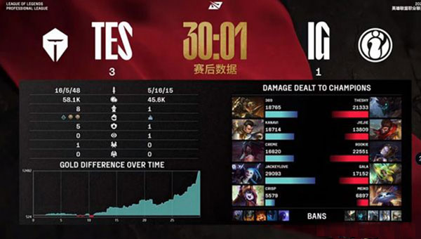 第四局,iG选出三核发育局但是前期基本没节奏,Jiejie猴子带猫还想来看小龙结果连续两次小龙团iG都是劣势!关键团战前期收头的Creme阿卡丽进场配合队友先斩Jiejie猴子,iG不得不看厄塔汗结果被TES前后包夹打出0换2!拉开了经济差!TES拿下大龙之后不给iG拖的机会,直接上野带队冲锋高地完成强杀,结束本场BO5将iG淘汰!自己晋级败者组第二轮,将要对阵NIP!本局MVP为Creme!