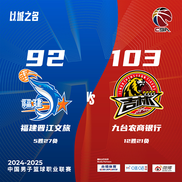 JRS直播吧讯 北京时间1月20日讯 CBA常规赛继续进行,福建主场迎战吉林,吉林近期遭遇连败,目前11胜21负暂列联赛第15位,福建上场不敌广东,5胜26负联赛垫底。此役一上来双方便陷入缠斗,约瑟夫-杨和邹阳联手取分,琼斯盘活全队强势回应,两队你来我往比分紧咬,首节结束时福建领先2分,次节回来,双方继续鏖战,路易斯-金突然发力单节贡献12分,琼斯和基兹林克接连回应,半场战罢,福建依然领先2分。短暂休整后福建一波8-0一度拉开比分,吉林及时回暖连中三分,三节结束后吉林反超1分,末节决战,福建进攻滞涩,琼斯予取予求率队奠定胜势,福建追分无望,最终吉林103-92力克对手。