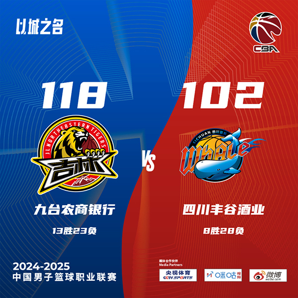 JRS直播吧讯北京时间3月5日讯 CBA常规赛战火重燃,吉林坐镇主场迎战四川,四川目前8胜27负排在联赛第17位,吉林12胜23负位列第14。此役一上来双方早早进入状态陷入僵持,琼斯连续取分对飚萨姆纳,首节结束时吉林领先2分,次节回来,双方延续火力拉开对攻,萨姆纳联手亨特不断打进,但基兹林克单节狂揽20分强势回应,半场战罢,吉林确立10分优势。短暂休整后王薪凯连中三分掀起反扑号角,四川多点开花蚕食分差,三节结束后吉林仅领先1分,末节决战,四川进攻彻底断电,吉林延续火力终结悬念,最终吉林118-102击败四川送对手7连败。
