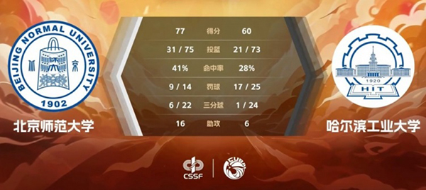 JRS直播吧讯3月12日 CUBAL东北赛区小组赛,北京师范大学对阵哈尔滨工业大学。首场小组赛,两队皆获胜。比赛开始,吴士广篮下先拿2分为北京师大开局,哈工大开局很是慢热被北京师大打出9-0开局。打了3分钟杨淳君终于为哈工大开局,周鑫也连续得分,但吴士广补篮回应,肖洋三分开和后北京师大领先到双位数。周鑫三分再止血,吴士广继续二次进攻打成,首节北京师大26-12领先哈工大。次节上来,哈工大进攻端还是不在状态,北京师大顺势扩大领先。辛泽林造杀伤终于打破僵局,但两队进攻端命中率都不高,场上频频打铁。随后高梓淇接连三分命中帮助北京师大稳住领先优势,杨淳君连续前场篮板终于打成二次进攻拿到运动战进球得分,半场北京师大43-26继续领先哈工大。易边再战,双方连续几回合尝试三分但都没有命中,打了3分多钟各自仅得2分。杨淳君冲击造杀伤、强打2+1带队追分,北京师大及时调整,邵振恒站出来连续抢到前场篮板,里突外投三分也开和砍下7分强势回应。哈工大还是依靠拼抢前场篮板获得进攻机会,连续罚球追分,但三节北京师大57-46还领先哈工大11分。末节决战,双方上来又是连续打铁,邵振恒连攻加传帮助北京师大牢牢掌握住十几分领先。江龙接连打成二次进攻止血,但肖洋三分被犯规后三罚全中再回应,随后肖洋里突外投再连得6分杀死比赛,最终北京师大77-60战胜哈工大。