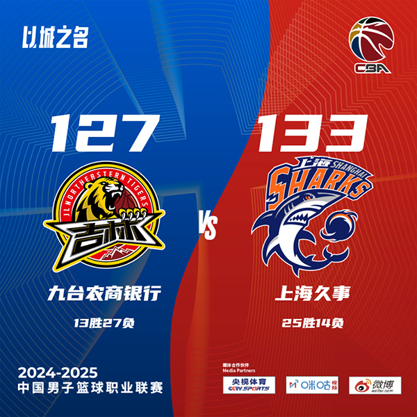 JRS直播吧讯 北京时间3月14日中国男子篮球职业联赛 常规赛,九台农商银行对阵上海久事。半场吉林75-80上海,最终吉林127-133上海。九台农商银行多米尼克-琼斯30分12板14助,托马斯-基兹林克27分2板5助;上海久事洛夫顿29分13板13助,李添荣28分3板3助。