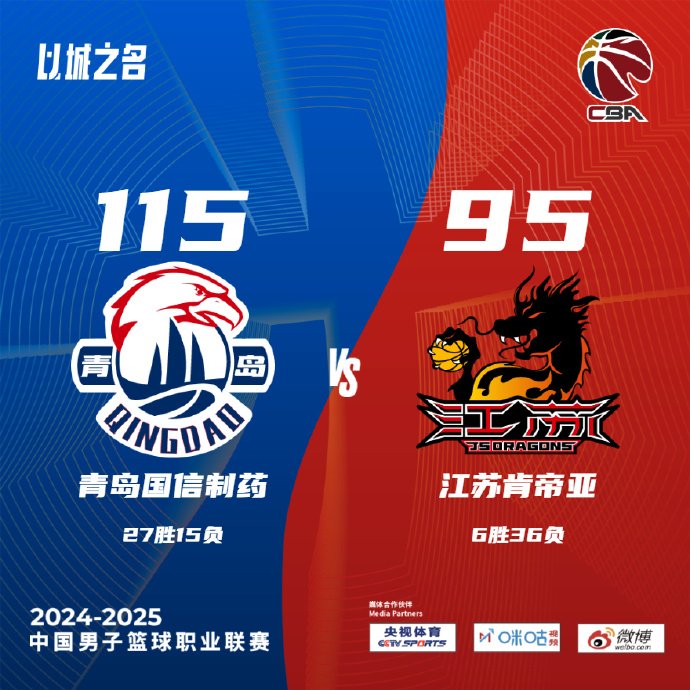 JRS直播吧3月19日讯 CBA常规赛,青岛主场迎战江苏。青岛26胜15负排在联赛第9,江苏6胜35负联赛垫底。一开场,江苏打出8-3的开局,青岛轮番冲击篮筐频频得手迅速扳平比分,此后双方陷入缠斗,青岛持续发力打出10-0的攻击波确立两位数优势,江苏不断杀入内线拿分努力追赶,半场战罢青岛63-54领先江苏。下半场,青岛攻防两端压制对手,一举将分差拉开到20分以上,末节青岛稳扎稳打将优势保持到最后,最终,青岛115-95大胜江苏,送给对手8连败。