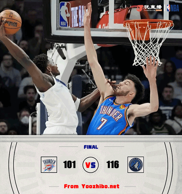 JRS直播吧讯2月14日NBA常规赛,森林狼主场迎战雷霆。两队皆是背靠背,森林狼2连败后30胜25负排在西部第7位,雷霆则是豪取7连胜,44胜9负高居联盟榜首。本场比赛,森林狼戈贝尔和康利缺阵;雷霆卡鲁索也不打。比赛开始,亚历山大不在状态连续打铁,雷霆进攻端也受阻,而森林狼则是活力十足,爱德华兹送暴力隔扣,香农也成为奇兵,首节森林狼领先13分,次节双方展开拉锯战,杰伦威接连突破单节上双带队追分,但里德能给出回应,香农压哨勾手命中助森林狼半场还领先8分。第三节,雷霆上来就接连攻击内线一度反超比分,但沃克和里德、爱德华兹接连4记三分轰出12-0攻击波强势回应,随后双方拉锯战三节森林狼还领先10分,末节森林狼接连攻击内线一波10-2再次拉开比分,随后森林狼牢牢保持住十几分领先,双方换上替补练兵,最终森林狼116-101力克雷霆,终结对手7连胜。