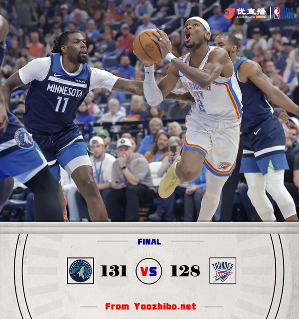JRS直播吧讯北京时间2月25日讯 NBA常规赛,雷霆坐镇主场再战森林狼。雷霆46胜10负联盟第一,森林狼31胜27负。上一场比赛,雷霆客场力克森林狼。比赛开始,双方开场势均力敌,比分始终紧咬,森林狼多点开花,雷霆里突外投强势回应,次节森林狼命中率下降,雷霆趁势将分差拉开到两位数,森林狼仍无起色,半场战罢雷霆64-45领先森林狼。易边再战,两队大打对攻,雷霆保持着20分左右的优势,末节森林狼不断冲击篮筐连投带罚苦苦追赶,爱德华兹被换下,森林狼轰出16-0攻击波第四节单节41-19净胜森林狼22分将比赛拖入加时。加时赛,双方继续缠斗,比分交替领先,爱德华兹重新披挂上阵,里德补篮造杀伤两罚全中带队重获1分优势,爱德华兹血帽亚历山大,沃克两罚全中,亚历山大绝平三分没有,最终,森林狼加时131-128逆转雷霆。
