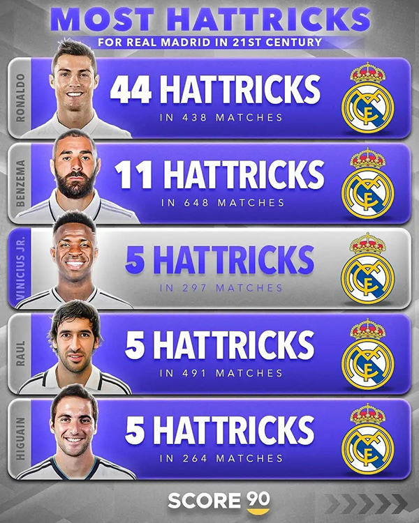 JRS直播吧讯21世纪皇马球员戴帽次数TOP10: