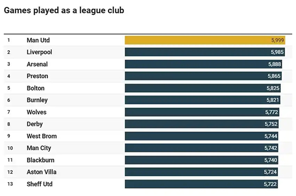 目前的英格兰俱乐部出战场次排行榜中,曼联以5999次居首,高于利物浦和阿森纳。